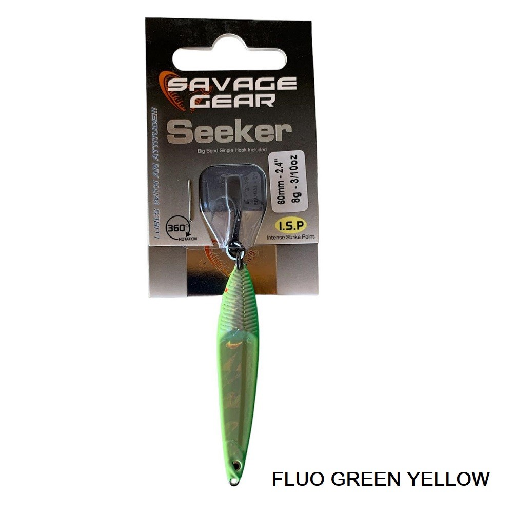 Seeker sahte, rüzgarlı koşullarda bile iyi performans alabileceğiniz çok uzak menzil atışlar için tasarlanmıştır. Dar tasarımı sayesinde sahte çok canlı ve düzensiz bir aksiyon gösterir. En ufak bir dönüşte en inanılmaz 360 derece dönüşler ile suda inanılmaz bir parıltı yaratır. Her sahtede ultra keskin bir Savage Gear Y-üçlü iğne ile geniş ağızlı gaga uçlu tekli iğne vardır. Böylece kullanıcı karşı karşıya kaldığı şartlarda hangi iğnenin en iyi olduğunu seçebilir. ISP = Yoğun Saldırı Noktası. Sahtenin gövdesinde önceden delinmiş deliklere güçlü gece Glow ve UV epoksi malzeme ile dolduruldu. Şimdiye kadar gördüğünüz en yoğun vuruş performans noktaları yaratmayı başardık! Yoğun vuruş performans noktaları alabalık ve levreği baştan çıkarır. İğnenin olduğu kuyruk bölümünde sahteye sert bir şekilde saldırırlar, mükemmel bir takılma oranı sağlar.